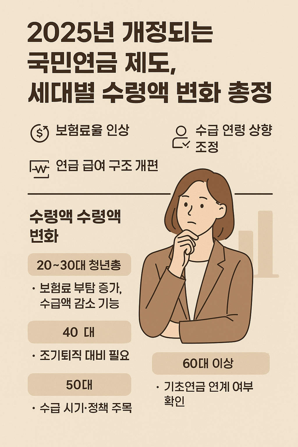 2025년, 우리나라 국민연금 제도가 대대적으로 개편됩니다. 고령화 사회 심화, 재정 고갈 우려에 대응하기 위해 정부는 국민연금의 '보험료율 인상', '수급 연령 조정', '급여 구조 개편' 등의 조치를 예고했는데요. 이번 글에서는 세대별 수령액이 어떻게 달라지는지, 어떤 점에 주목해야 하는지를 한눈에 정리해 드리겠습니다.국민연금 제도 개편 주요 포인트1. 보험료율 인상현재 국민연금 보험료율은 소득의 9% 수준입니다. 하지만 2025년부터는 단계적으로 12%까지 인상될 예정입니다.이는 재정 안정화를 위한 불가피한 조치로, 현재 20~30대 청년층은 부담이 다소 커질 수 있습니다. 반면, 지금 연금을 받고 있는 60대 이상은 인상 부담 없이 혜택을 누릴 수 있습니다.✓ 포인트: 소득 대비 연금 가입 부담이..