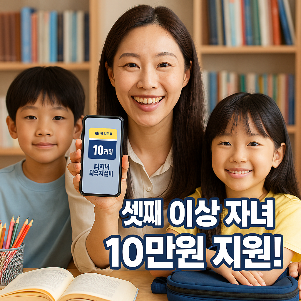 2025년 세종시에서는 다자녀 가정의 교육비 부담을 덜어주기 위한 실질적인 지원책으로셋째 이상 자녀에게 1인당 10만 원 상당의 모바일상품권을 지원하는 정책을 시행합니다.이번 정책은 세종시에 거주하면서 세 자녀 이상을 양육 중인 가정 중,셋째 이상 자녀가 초등학교 3학년 이상~고등학교 2학년 재학 중일 경우 신청할 수 있습니다.이제 세 자녀 이상을 둔 학부모라면 누구나 의류·신발·도서·문구·가전 등 실질적인 교육 물품 구입에 활용 가능한 상품권을 받을 수 있으니, 놓치지 말고 꼭 신청하세요!✅ 지원대상 – 누가 받을 수 있나요?세종시에 주소를 둔 다자녀 가정셋째 자녀부터 해당되며, 반드시 다음 조건을 충족해야 합니다:2025년 기준 초등학교 3학년~고등학교 2학년 재학 중세종시 관내 초·중·고에 재학 중..