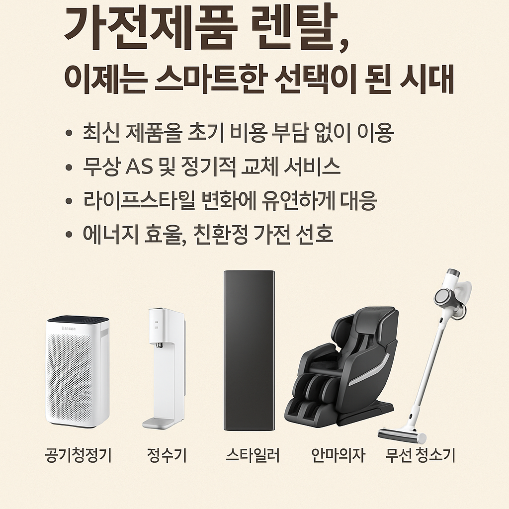 가전제품은 더 이상 ‘사야 하는 것’이 아닙니다. 2025년 현재, 렌탈로 사용하는 가전제품이 하나의 라이프스타일로 자리 잡고 있습니다. 냉장고, 세탁기, 정수기 같은 기본 가전부터 스타일러, 건조기, 공기청정기, 안마의자 등 프리미엄 제품까지, 필요한 시점에 필요한 만큼 빌려 쓰는 합리적 소비문화가 확대되고 있는 것입니다. 이 변화는 단순한 비용 절감을 넘어 삶의 질을 높이는 전략적인 소비방식으로 해석됩니다.