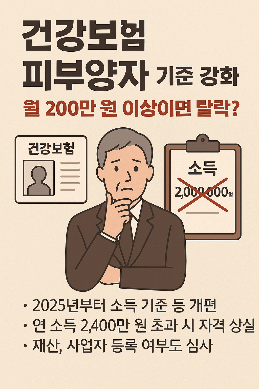 2025년부터 건강보험공단은 아래 기준에 따라 피부양자 자격을 재정비할 예정입니다: