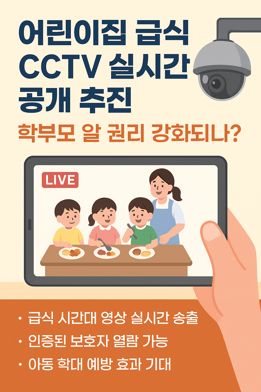 최근 교육부와 보건복지부는 어린이집 내 CCTV를 실시간으로 공개하는 방안을 검토 중이라고 밝혔습니다. 이는 아동학대 예방과 보육의 투명성 확보를 위한 대책 중 하나로, 특히 급식 시간의 실시간 영상 공개를 통해 학부모의 알 권리와 안심권을 보장하겠다는 취지입니다.