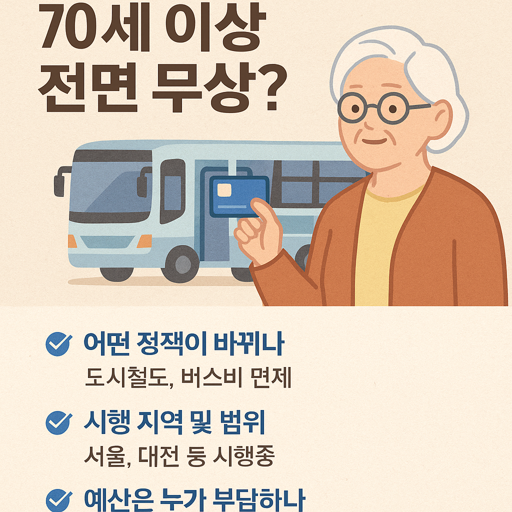 정부는 70세 이상 노인을 대상으로 교통비 전면 무상화를 검토 중이며, 일부 지자체는 이미 지하철·버스 무임 혜택을 시행하고 있습니다.
