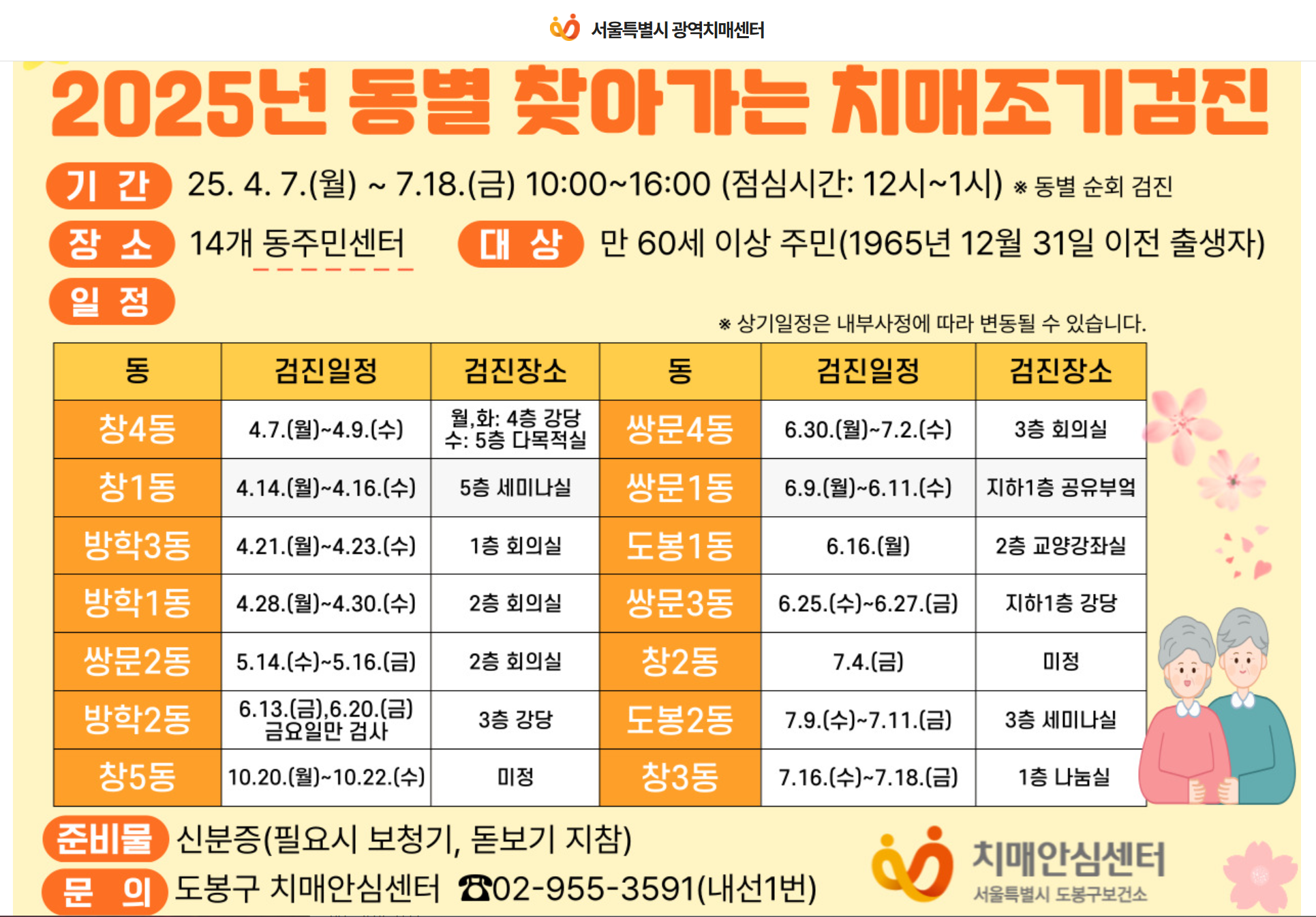 서울특별시 도봉구 치매안심센터는 지역 주민들의 건강한 노후를 위해 **2025년 '동별 찾아가는 치매조기검진'**을 실시합니다. 이 검진은 만 60세 이상 주민을 대상으로 하며, 바쁜 일상이나 이동이 어려운 어르신들이 가까운 동주민센터에서 간편하게 검진을 받을 수 있도록 기획된 사회복지 서비스입니다.