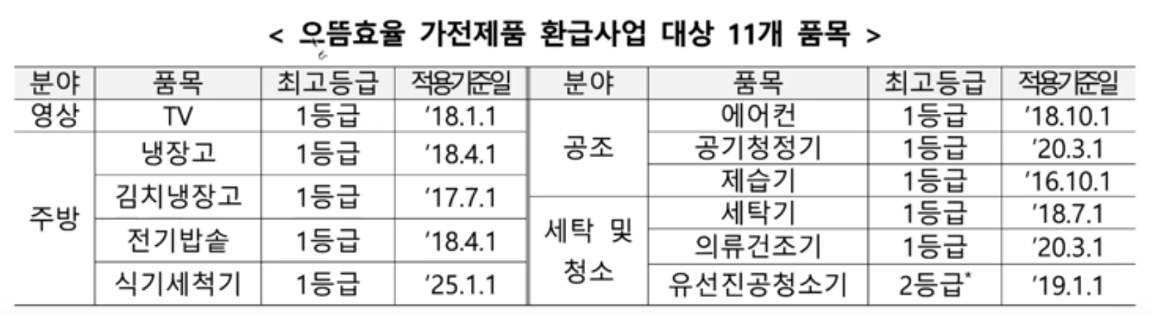 환급사업의 대상은 만 19세 이상 대한민국 국민 전체이며, 대상 품목은 총 11개 품목으로 구성되어 있습니다. 냉장고, 김치냉장고, 에어컨, 세탁기, 전기밥솥, 유선진공청소기, 공기청정기, TV, 제습기, 의류건조기, 식기세척기가 포함됩니다. 이들 제품은 모두 에너지소비효율 1등급 등 최고등급 제품이어야 환급 대상이 됩니다.