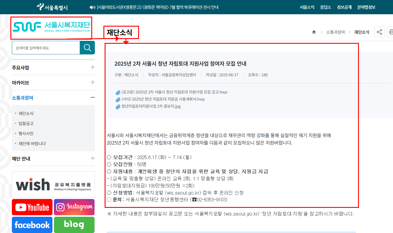 신청 사이트: 서울복지포털 → '청년 자립토대 지원' 메뉴 신청 절차: