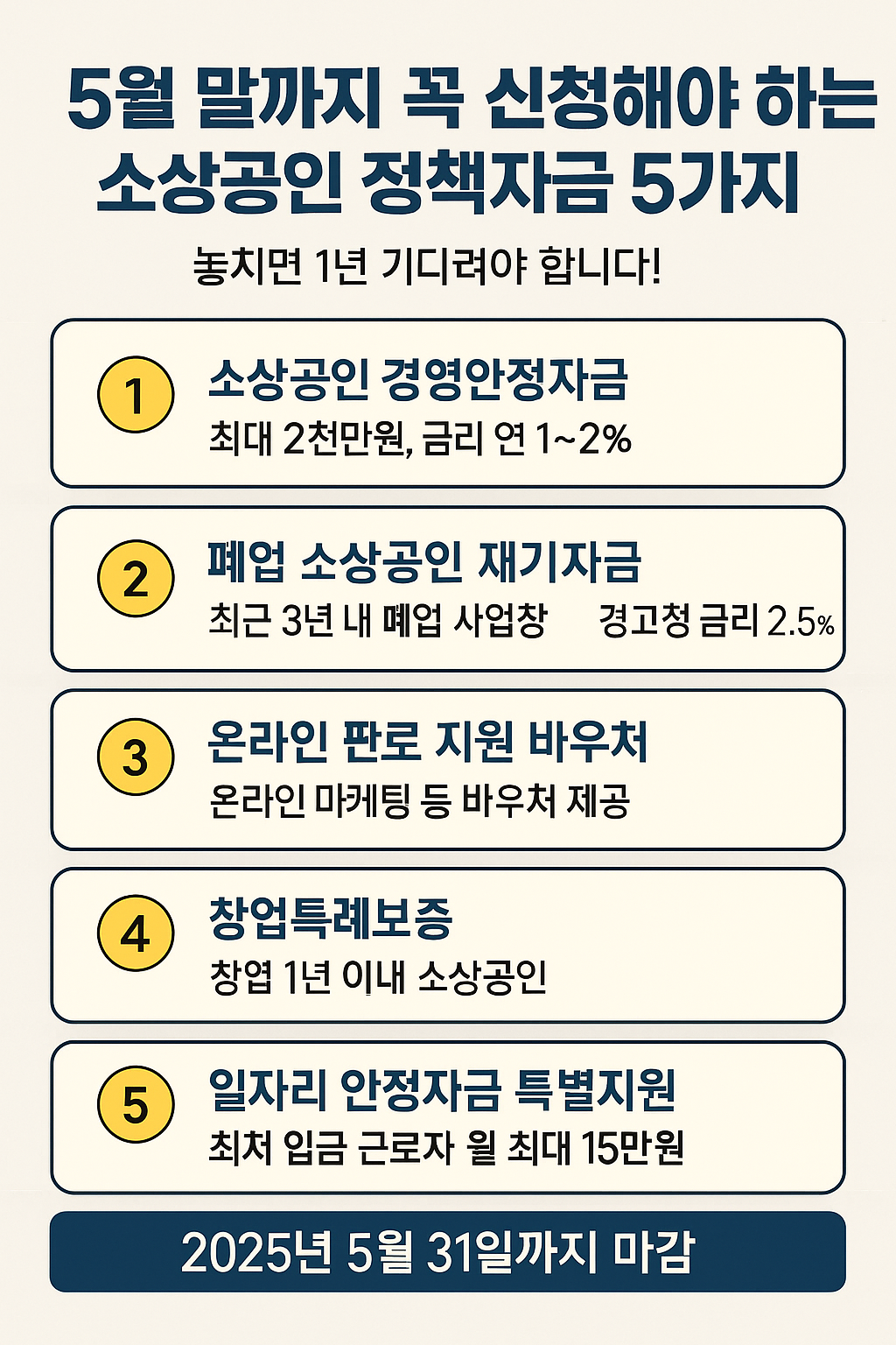 특히 5월 말 마감 예정인 긴급 정책자금들이 있어, 미리 체크하고 준비하지 않으면 올해 내내 기회를 놓칠 수도 있습니다.