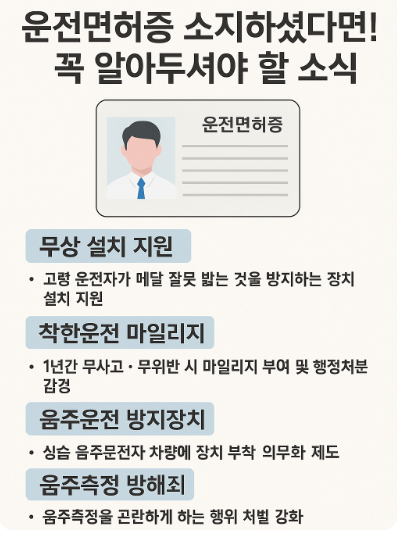 운전면허 소지자로서 지속적으로 변경되는 도로교통법과 안전운전을 위한 지원 제도에 대해 알고 계시는 것은 매우 중요합니다. 고령운전자를 위한 페달조작 방지장치 무상 지원, 착한 운전 마일리지 제도, 음주운전 방지장치 의무화, 그리고 2025년 6월부터 시행되는 음주측정 방해 행위 처벌 강화 등은 모두 운전자와 다른 도로 이용자들의 안전을 위한 중요한 정책입니다.