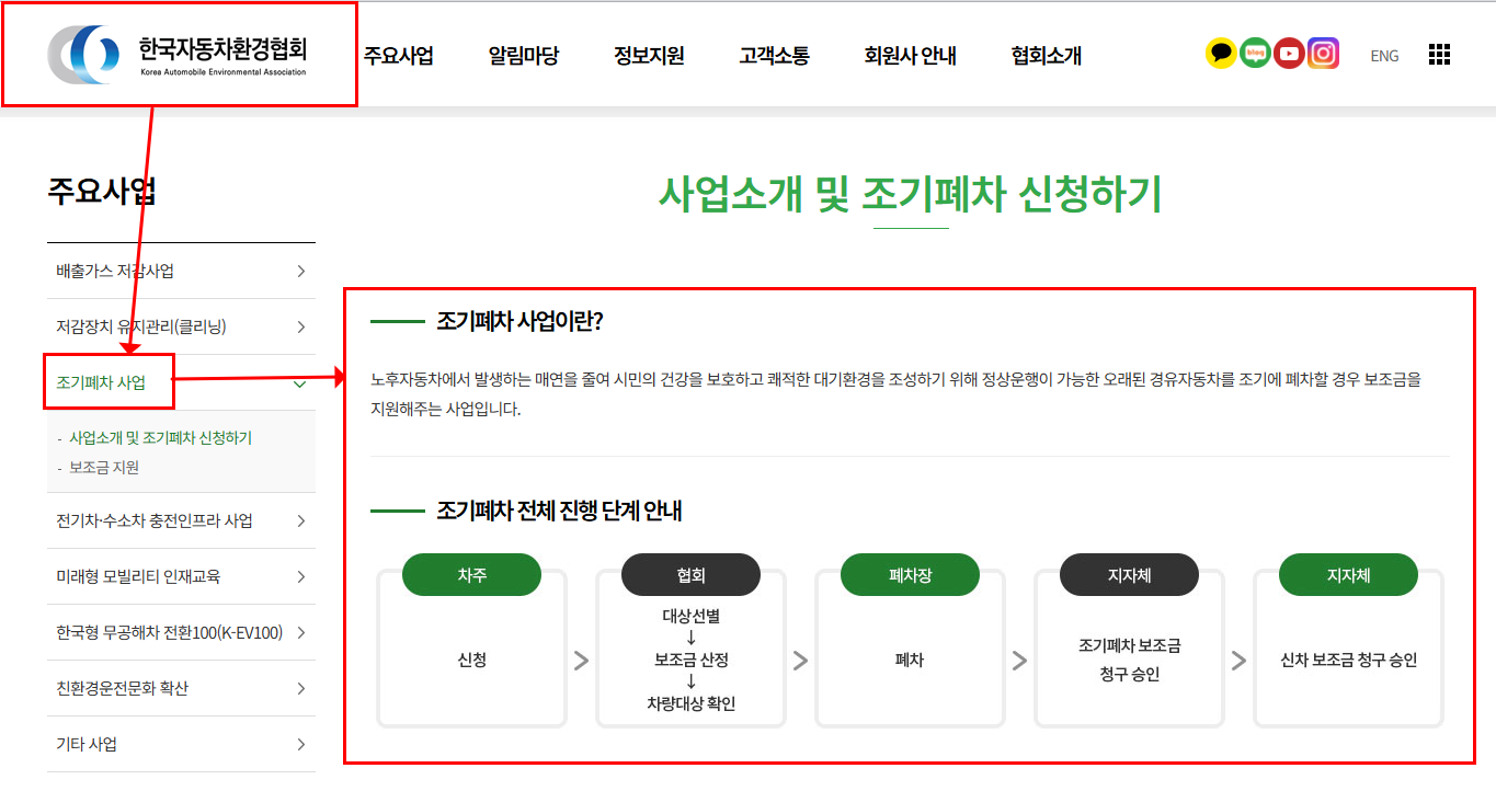 • 조기폐차 신청 → 대상확인서 발급 → 성능검사 → 폐차 진행 → 보조금 신청 → 보조금 지급