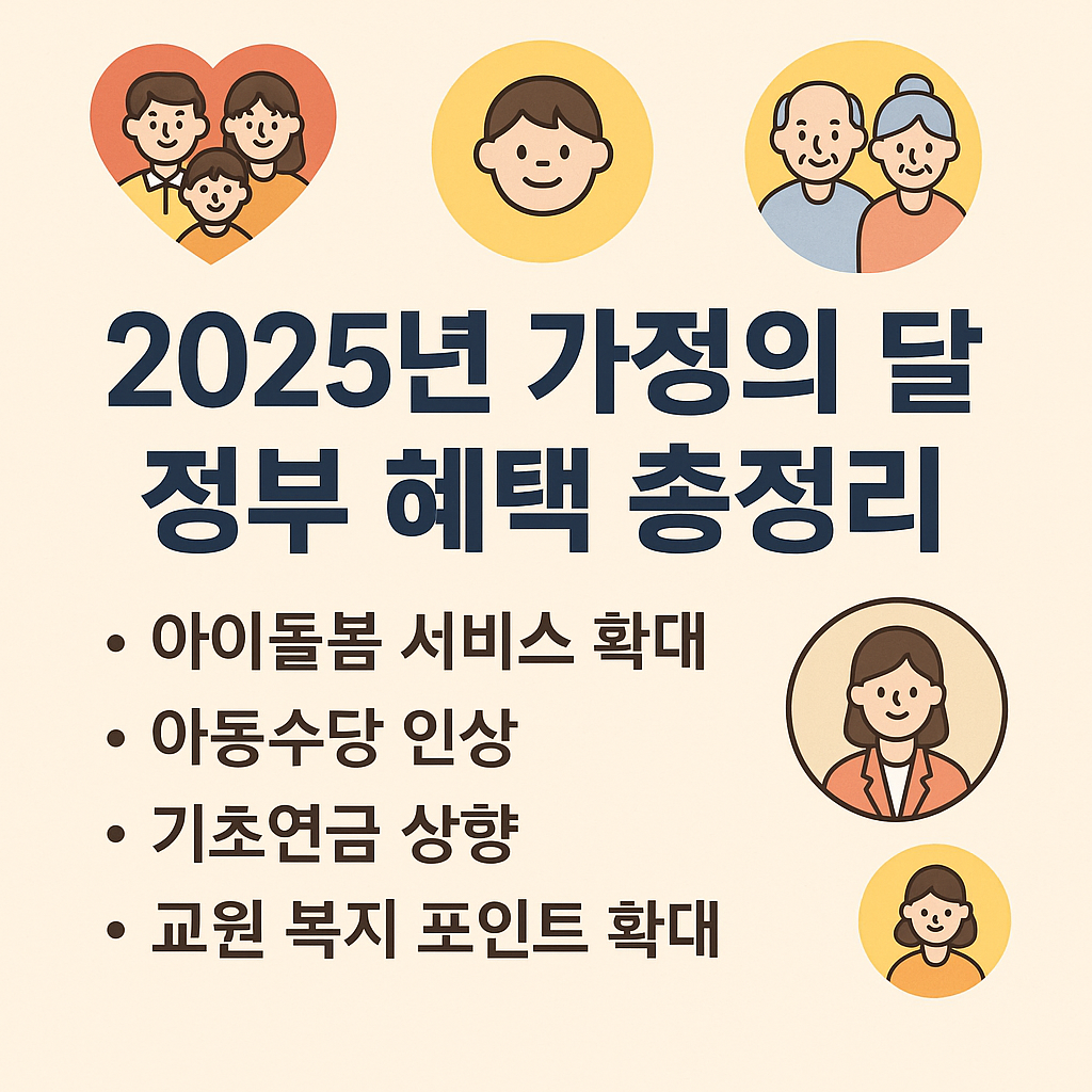 가정의 달 5월이 다가오면서 정부와 지자체에서 제공하는 다양한 복지 혜택과 지원정책에 관심이 쏠리고 있습니다. 어린이날, 어버이날, 스승의 날 등 가족의 의미를 되새기는 5월은 단순한 기념일을 넘어 실질적인 생활지원 혜택이 쏟아지는 시기이기도 합니다. 특히 2025년에는 저출산 대책 강화, 고령층 복지 확대, 교육 디지털화 대응 등과 맞물려 다양한 맞춤형 지원제도가 발표되었습니다. 지금부터 꼭 챙겨야 할 2025년 5월 가정의 달 정부 혜택을 총정리해드립니다.👶 1. 어린이날 맞춤형 육아·보육 지원 강화아이돌봄 서비스 시간 확대: 맞벌이 가정을 위한 시간당 지원이 최대 840시간까지 확대되었습니다. 신청은 아이돌봄 공식 홈페이지 또는 거주지 주민센터에서 가능하며, 소득 수준에 따라 정부지원 비율도 차등..