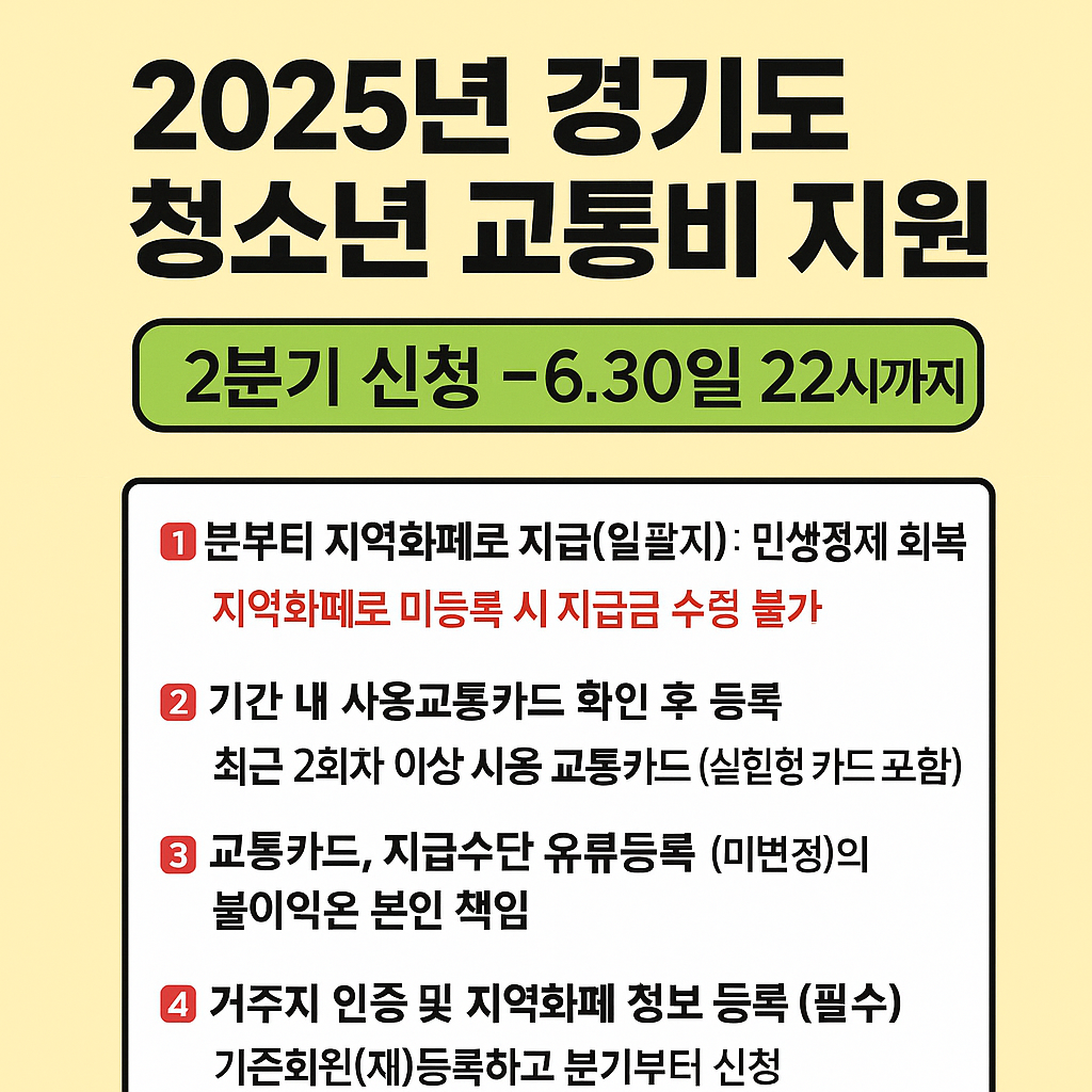 경기도에 거주하는 청소년과 학부모라면 주목해야 할 소식입니다.2025년 경기도 청소년 교통비 지원 2분기 신청이 6월 30일(일) 밤 10시까지 진행됩니다.이번 2분기부터는 지급 방식에 큰 변화가 있으므로, 반드시 아래 내용을 숙지하고 놓치지 말고 신청하세요!✅ 1. 2분기 신청 기간과 마감일신청 기간: 2025년 6월 1일(토) ~ 6월 30일(일) 밤 22시지급 대상 교통비 사용 기간: 2025년 4월 1일 ~ 6월 30일지급 시기: 신청 완료 후 7월 중 지역화폐로 일괄 지급이번 2분기 신청은 단 한 번의 신청으로 자동 지급되기 때문에, 신청 마감일을 절대 넘기지 않도록 주의해야 합니다.🔁 2. 2025년부터 바뀐 지급 방식▶️ 기존과 달라진 점2025년부터는 지역화폐 일괄지급 방식으로 변경되며,..