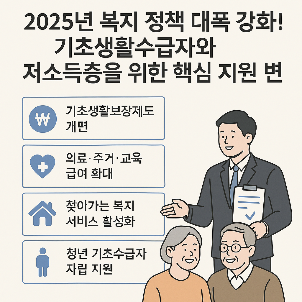 2025년 대한민국 복지 정책이 한층 더 강화된다. 정부는 사회적 약자 보호를 최우선 과제로 삼고, 기초생활수급자와 저소득층을 위한 다양한 정책을 본격적으로 추진하고 있다. 특히 경제 불균형 해소와 사회 안전망 강화를 위한 제도적 기반을 확대하고 있어 그 변화의 폭이 크다.기초생활보장제도 개편가장 주목할 변화는 기초생활보장제도의 지원 기준 완화다. 기존에는 소득·재산 기준이 까다로워 많은 국민들이 혜택을 받지 못했지만, 2025년부터는 선정 기준이 현실화되며 수급 대상자가 확대된다. 예를 들어, 가구의 부양의무자 기준이 완화되고, 청년·1인 가구 등에 대한 별도 기준이 마련되어 더욱 다양한 계층이 복지의 혜택을 받을 수 있게 되었다. 관련 정보: 보건복지부 국민기초생활보장제도 안내의료·주거·교육급여 확대..