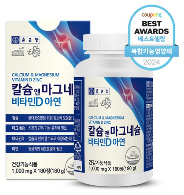 건강기능식품 중에서도 특히 매일 섭취해야 할 핵심 영양소를 꼽으라면 단연코 칼슘, 마그네슘, 비타민D, 아연입니다. 그런데 이 네 가지를 모두 한 알에 담은 제품이 있다면 어떨까요? 바로 종근당 칼슘 앤 마그네슘 비타민D 아연입니다. 이미 14만 건이 넘는 상품평이 말해주듯, 지금 가장 인기 있는 건강기능식품 중 하나입니다.180정 대용량 제품으로 하루 1~2정을 꾸준히 섭취하면 한 병으로도 넉넉히 복용할 수 있습니다. 쿠팡특가 8,490원이라는 믿기 힘든 가성비로, 온 가족의 뼈 건강을 책임질 수 있는 최고의 선택이 될 것입니다.👉 지금 구매하러 가기종근당 칼슘 마그네슘 비타민D 아연, 왜 필수인가?칼슘: 뼈와 치아 건강의 핵심마그네슘: 근육 수축과 신경 전달에 필수비타민D: 칼슘 흡수 촉진 및 면역..