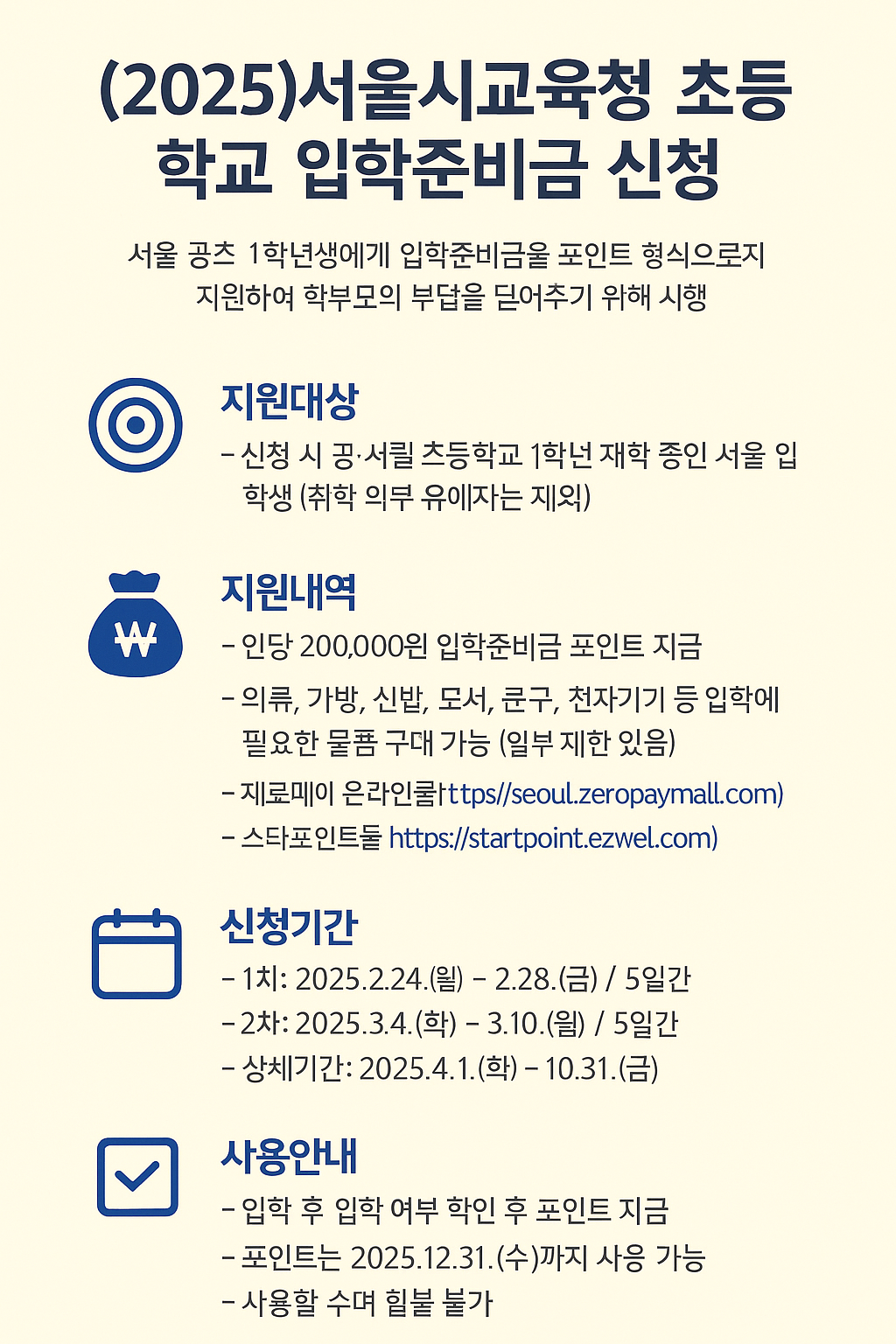 서울시교육청은 교육의 기회균등과 공공성 강화를 위해 초등학교에 입학하는 신입생을 대상으로 입학준비금 포인트를 지원하고 있습니다. 입학 전후로 발생하는 학용품, 의류, 전자기기 구입 부담을 덜어주기 위한 제도로, 학부모들의 경제적 부담을 줄이고 학생들에게 교육 기회의 형평성을 제공하는 데 그 목적이 있습니다.이번 글에서는 지원 대상, 지급 금액, 사용 방법, 신청 절차 등 꼭 알아야 할 사항들을 정리했습니다.🎯 지원 대상서울시 소재 공립·사립 초등학교에 입학하는 2025학년도 1학년 신입생신청 시 서울시에 주민등록이 되어 있는 아동만 해당단, 학교 밖 학생(예: 대안학교 등)에 대해서는 신청이 불가능하므로 공식 초등학교 입학 예정자만 신청 가능이 제도는 초등교육을 시작하는 서울시 학생 모두가 기본적인 학..
