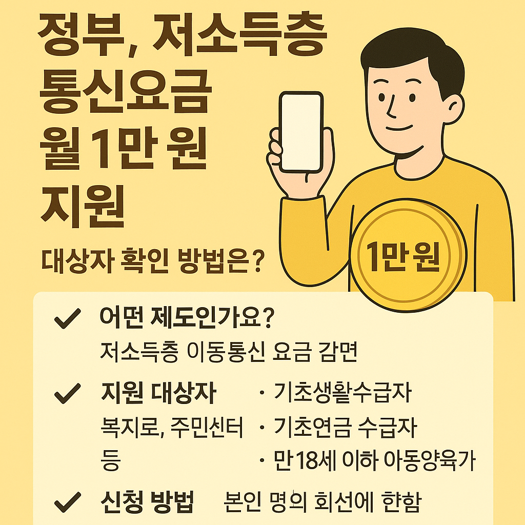 정부는 2025년 5월부터 저소득층을 위한 통신요금 감면 제도를 확대해,월 최대 1만 원까지 이동통신요금을 지원한다고 발표했습니다.이번 조치는 정보 격차 해소, 생계비 부담 완화, 디지털 접근권 보장을 목표로 하고 있으며,기초생활수급자 및 차상위계층은 자동 또는 간편 신청으로 혜택을 받을 수 있습니다.✔️ 어떤 제도인가요?이 제도는 **‘보편적 통신복지 지원 프로그램’**의 일환으로,저소득층이 기본적인 통신 서비스를 누릴 수 있도록 일정 금액을 요금에서 차감해주는 방식입니다.월 최대 감면액: 1만 원지원 방식: 요금 청구서에서 자동 차감적용 회선: 1인당 1개 회선 (휴대폰, 유심 포함)✔️ 지원 대상자 조건구분상세 내용기초생활수급자생계·의료·주거·교육급여 수급자차상위계층한부모가족, 장애(아동수당 포함)..