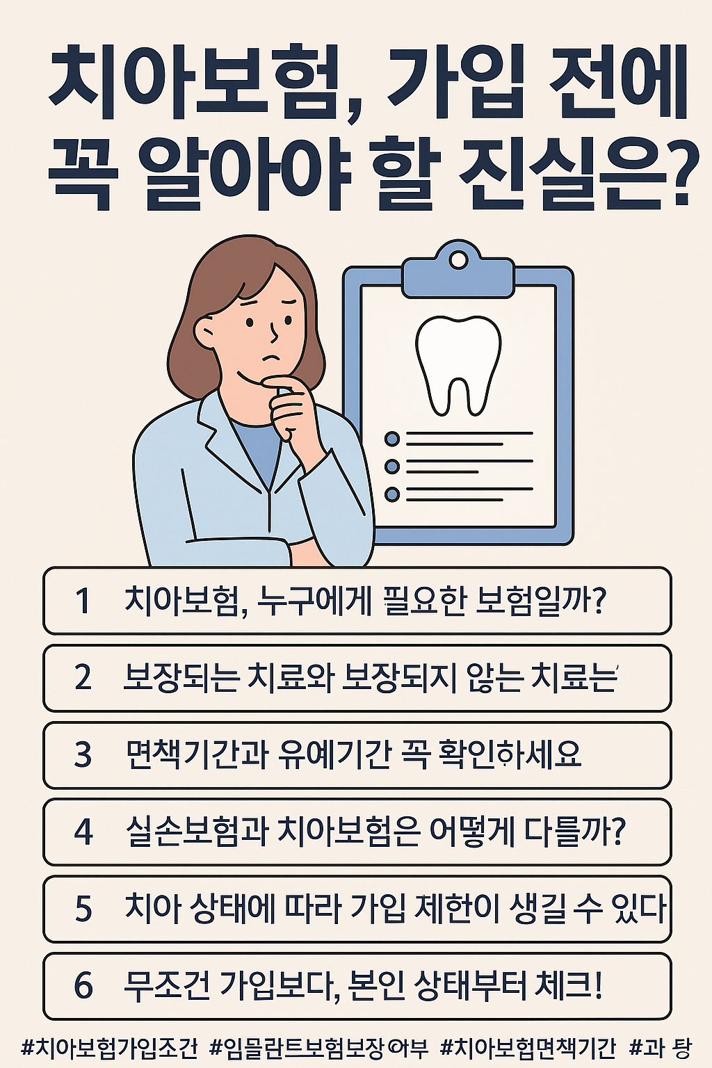 치과 치료비가 부담돼 치아보험을 고려하시는 분들이 많습니다. 그러나 막상 가입해보면 기대했던 보장이 적용되지 않거나, 보장 시작까지 시간이 오래 걸리는 경우도 많습니다. 특히 임플란트나 보철치료 보장은 까다로운 조건이 따르며, 면책기간·보장제외 항목 등 잘 살펴보지 않으면 낭패를 볼 수 있습니다. 이 글에서는 치아보험의 실제 보장 범위, 가입 전 꼭 알아야 할 숨은 진실을 6가지 핵심 포인트로 정리해드립니다.1. 치아보험, 누구에게 필요한 보험일까?치아보험은 건강보험 적용이 제한된 치과 치료비 부담을 줄이기 위한 목적이지만, 모든 사람에게 유용한 것은 아닙니다. 주기적 스케일링이나 예방치료가 필요한 사람에게 적합합니다.2. 보장되는 치료와 보장되지 않는 치료는?충치 치료, 신경치료는 비교적 보장되지만 임..