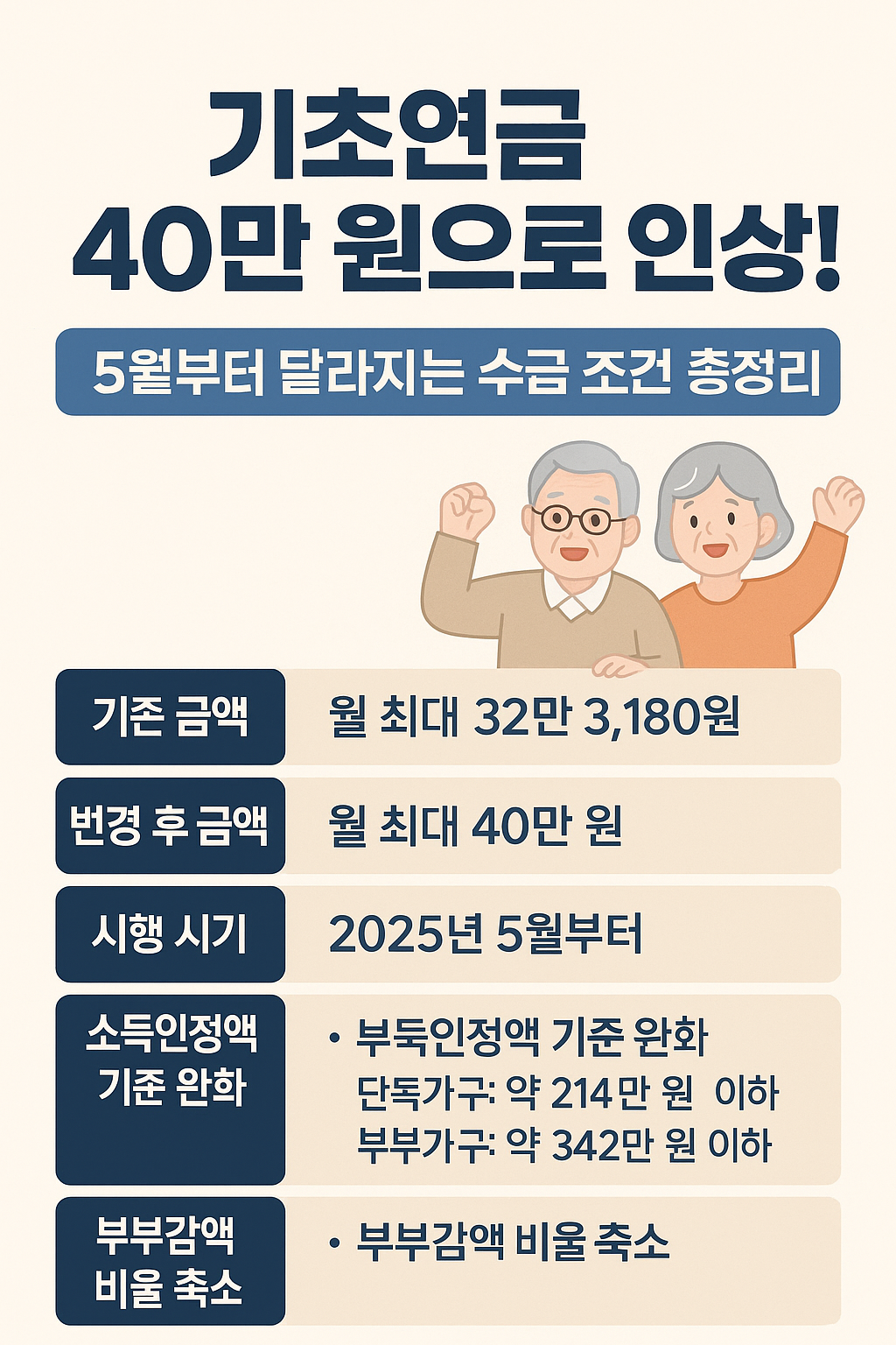 2025년 5월부터 기초연금 수급자에게 반가운 소식이 전해졌습니다.정부는 고령층의 안정적인 노후생활을 지원하기 위해 기초연금 지급액을 최대 40만 원까지 인상하기로 결정했습니다. 이번 인상은 특히 저소득 고령층에게 큰 도움이 될 것으로 예상되며, 수급 조건과 대상도 일부 조정되어 관심이 집중되고 있습니다.✅ 기초연금 인상 내용 한눈에 보기기존 금액: 월 최대 32만 3,180원변경 후 금액: 월 최대 40만 원시행 시기: 2025년 5월부터 단계적으로 적용우선 적용 대상: 생계·의료급여 수급자(약 75만 명 예상)이번 인상은 단순한 금액 확대에 그치지 않습니다. 저소득층 중심의 단계적 확대 정책이기 때문에, 수급 대상 선정 기준에도 변동이 있습니다.🧾 기초연금 수급 조건, 무엇이 달라졌을까?2025년부..