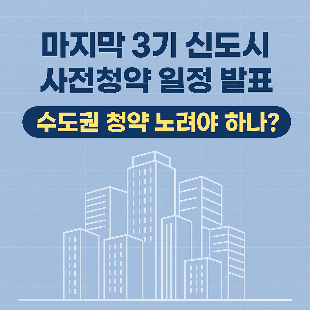2025년 부동산 시장의 최대 화두 중 하나는 단연 **‘3기 신도시 사전청약의 마지막 물량’**입니다. 국토교통부는 최근 남은 3기 신도시 공급계획과 사전청약 일정을 공식 발표하며 본격적인 막바지 공급 단계에 접어들었음을 알렸습니다. 2021년부터 시작된 3기 신도시 사업은 문재인 정부 시절 발표된 공급 확대 정책의 핵심으로, 서울 및 수도권의 주택난 완화를 목적으로 기획된 대규모 신도시 개발 사업입니다.이제 수요자들에게는 **‘진짜 마지막 기회’**가 찾아왔습니다. 특히 사전청약을 통해 분양가가 비교적 저렴하게 공급되는 점에서 2030 청년층, 신혼부부, 무주택자 중심으로 높은 관심이 이어지고 있습니다.📌 3기 신도시, 어디가 남았나?2025년 마지막 사전청약 대상지는 다음과 같습니다:남양주 왕숙고..