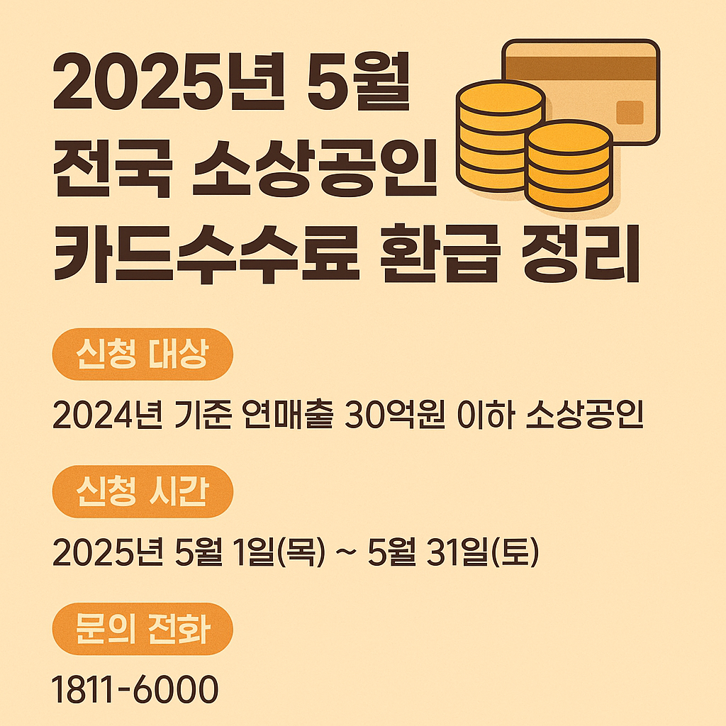 2025년 5월, 전국 각지의 지방자치단체들이 소상공인을 위한 카드수수료 환급 사업을 본격적으로 시행하고 있습니다. 특히 경기 침체와 고물가로 어려움을 겪고 있는 자영업자와 소상공인들에게는 이 같은 실질적 현금성 지원이 큰 도움이 되고 있습니다.이번 카드수수료 환급 사업의 공통된 핵심은 바로, 2024년 카드 매출을 기준으로 일정 비율(주로 0.5%)의 카드수수료를 지자체 예산으로 돌려주는 구조입니다. 신청은 대부분 해당 시군의 읍면동 행정복지센터나 시청 관련 부서, 혹은 **공식 웹사이트인 행복카드.kr**을 통해 가능합니다. 아래에 주요 지자체별 조건과 신청기간, 문의처까지 상세히 정리했습니다.✅ 전북 고창군지원내용: 카드 매출액의 0.5% 환급, 최대 50만 원대상조건: 연매출 3억 원 이하 소상공..