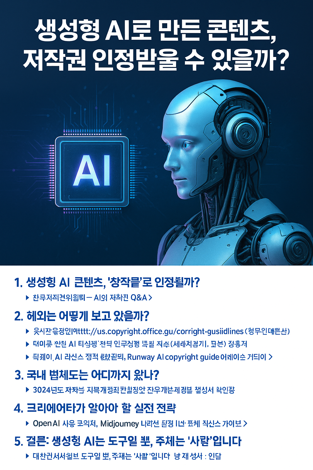 2025년, 생성형 AI는 콘텐츠 시장을 빠르게 변화시키고 있습니다. 하지만 그 속도가 법제도와 윤리를 앞서가면서 ‘저작권 인정 여부’에 대한 혼란도 커지고 있습니다.아래에서는 주요 이슈별로 실제 참고할 수 있는 공식 기관, 정부 자료, 국내외 정책 사이트 링크를 함께 안내합니다.1. 생성형 AI 콘텐츠, ‘창작물’로 인정될까?한국 저작권법상 인간의 창의성이 개입되어야 저작물로 인정되며, AI 단독 산출물은 기본적으로 저작권 보호 대상이 아닙니다.도움되는 링크👉 한국저작권위원회 - AI와 저작권 Q&A2. 해외는 어떻게 보고 있을까?해외에서도 AI 콘텐츠에 대한 저작권 인정 여부는 국가마다 다르게 해석되고 있으며, 점진적인 법 개정이 진행 중입니다.도움되는 링크👉 미국 저작권청(USCO) - AI 창..
